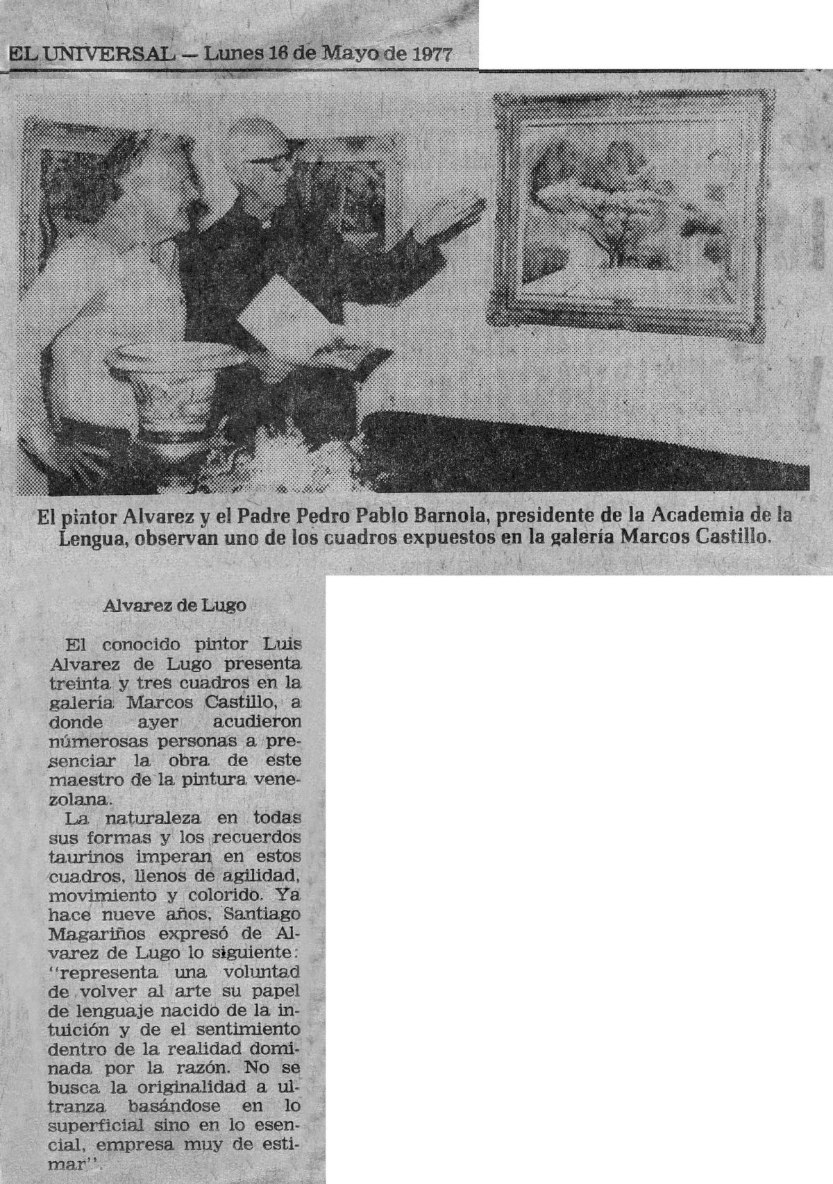 El conocido pintor Luis Alvarez de Lugo presenta treinta y tres cuadros en la galería Marcos Castillo, a donde ayer acudieron numerosas personas a presenciar la obra de este maestro de la pintura venezolana.