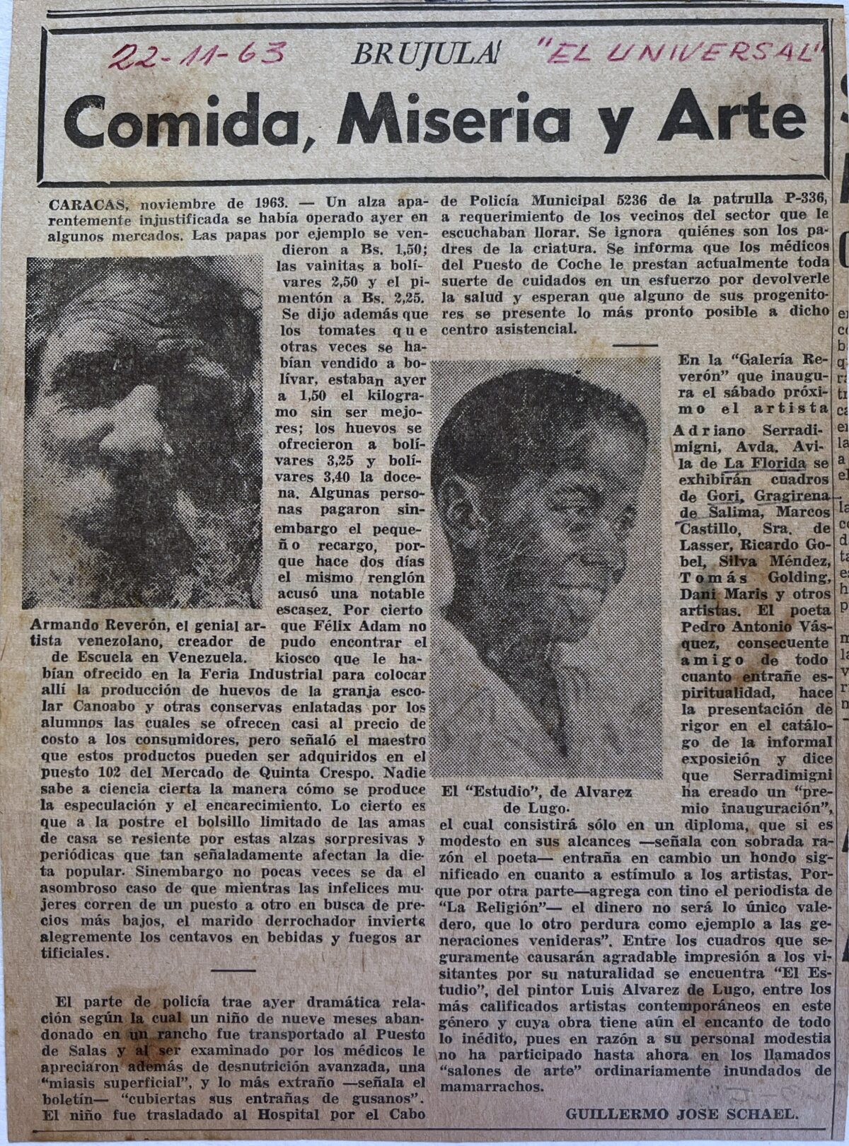 This is a transcription of the provided newspaper clipping from El Universal, dated November 22, 1963. The article, written by Guillermo José Schael, juxtaposes the harsh economic and social realities of Caracas with the local art scene of the time.