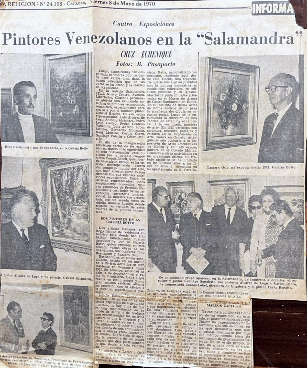 En la Galería Salamandra (Edif. Nuevo Centro, Avenida Libertador, Chacao) permanece abierta una estupenda colectiva de pintores venezolanos, organizada especialmente para esa sala por el también pintor Gabriel Bracho. En ella están representados: Luis Alvarez de Lugo, Antonio Alcántara, Pedro León Castro, Pedro Centeno Vallenilla, Luis Alfredo López Méndez, Bernardo Monsanto, Raúl Moleiro, Carlos Otero, Santiago Poletto y César Rengifo.