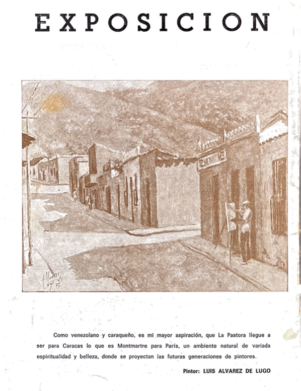 EXPOSICION “Como venezolano y caraqueño, es mi mayor aspiración, que La Pastora llegue a ser para Caracas lo que es Montmartre para París, un ambiente natural de variada espiritualidad y belleza, donde se proyectan las futuras generaciones de pintores.” Pintor: LUIS ALVAREZ DE LUGO