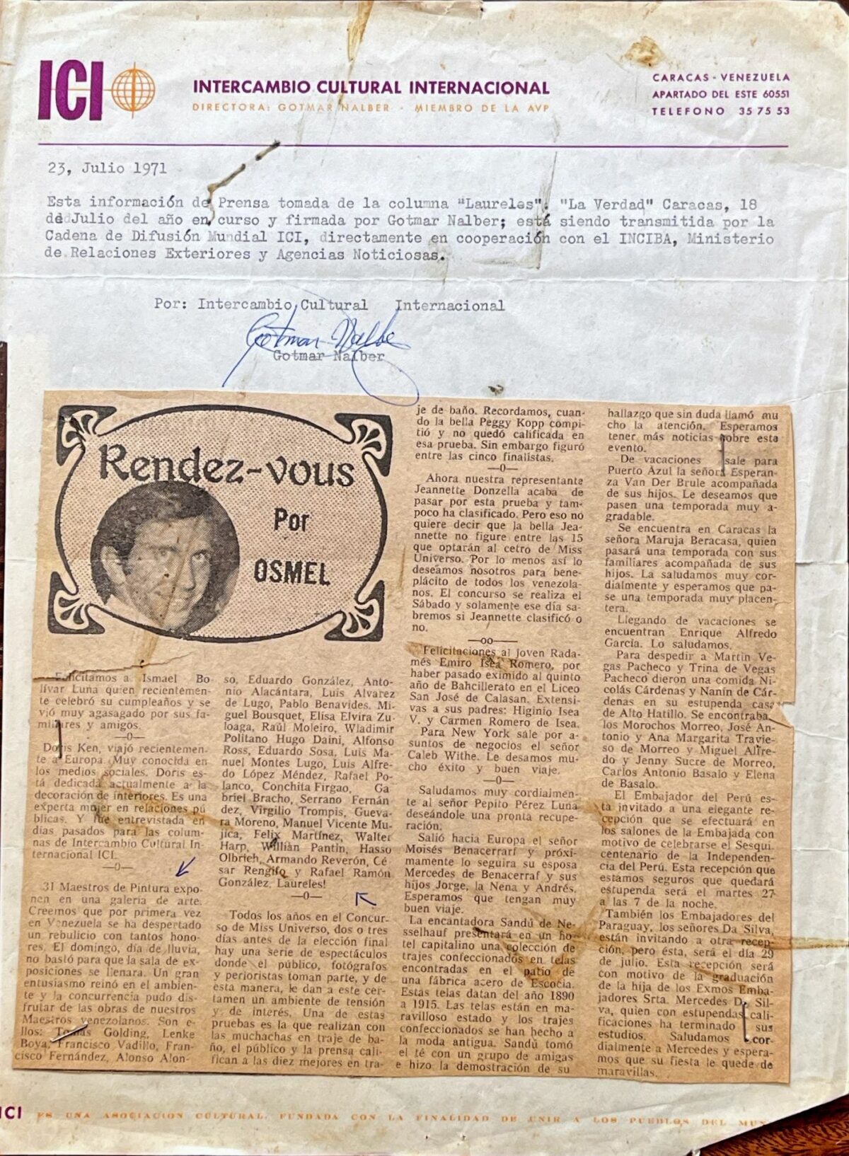 ICI – INTERNATIONAL CULTURAL EXCHANGE Director: Gotmar Nalber — Member of the AVP Caracas – Venezuela Apartado del Este 60551 Telephone: 35 75 53