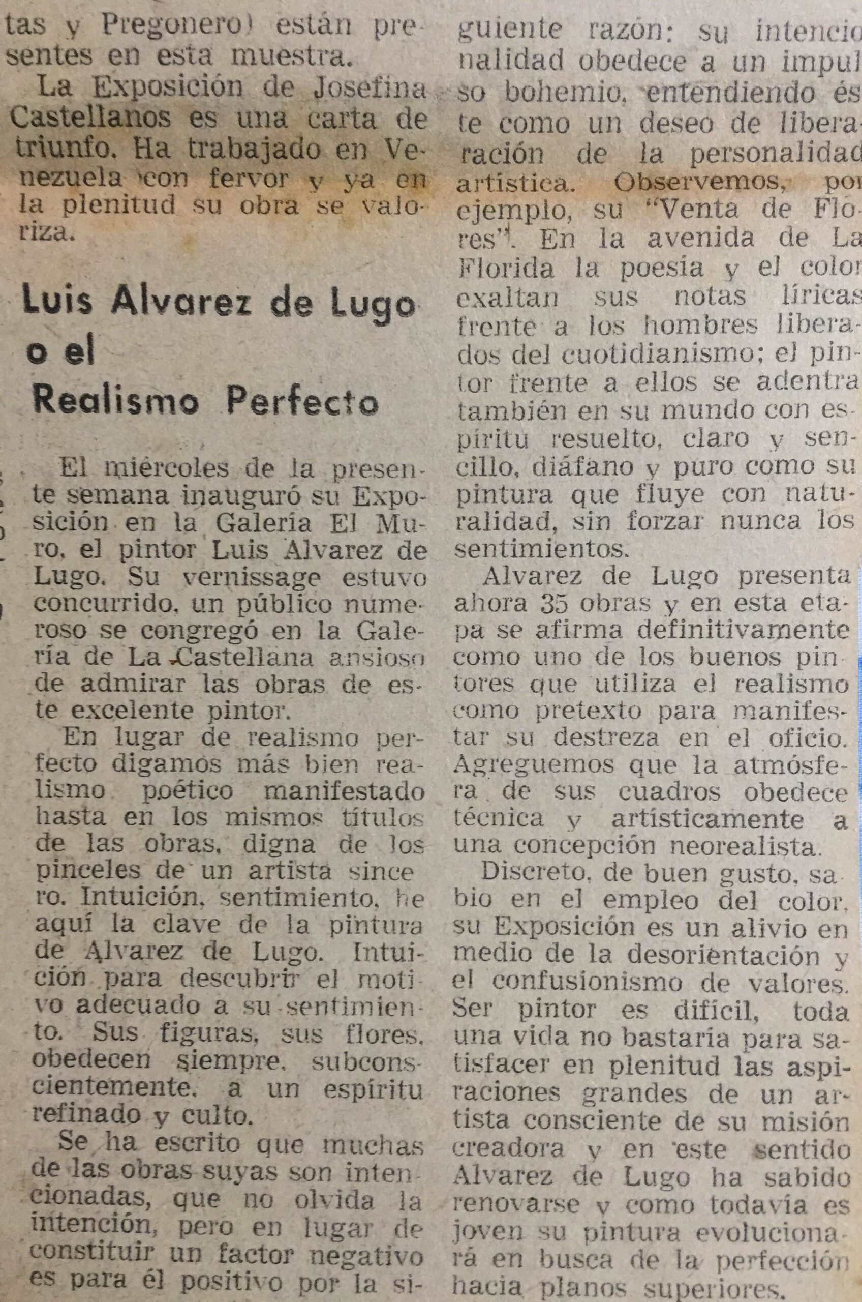 Mr. Alvarez de Lugo’s exhibition “is an index of his dedication to painting... his canvases are full of honesty and joy and his techniques insinuate his tremendous esthetic qualities