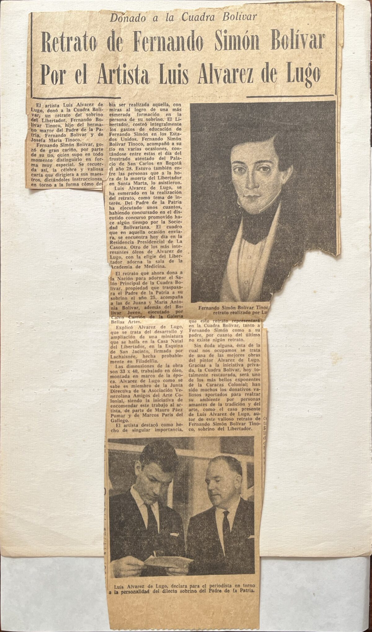 El artista Luis Alvarez de Lugo, donó a la Cuadra Bolívar, un retrato del sobrino del Libertador, Fernando Bolívar Tinoco, hijo del hermano mayor del Padre de la Patria, Fernando Bolívar y de Josefa María Tinoco.