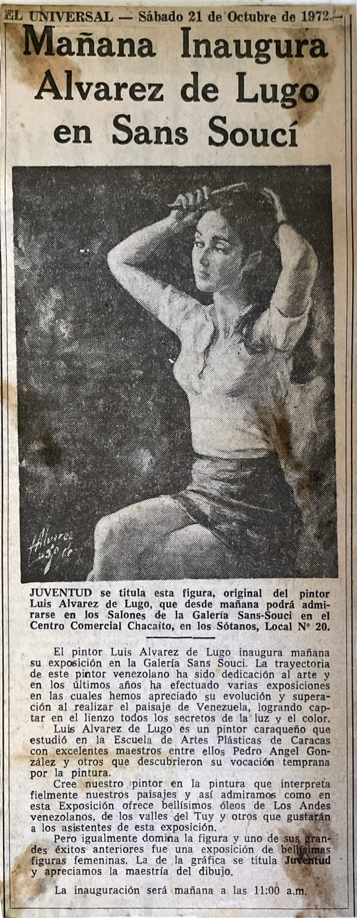 Cuerpo del texto: El pintor Luis Alvarez de Lugo inaugura mañana su exposición en la Galería Sans Souci. La trayectoria de este pintor venezolano ha sido dedicación al arte y en los últimos años ha efectuado varias exposiciones en las cuales hemos apreciado su evolución y superación al realizar el paisaje de Venezuela, logrando captar en el lienzo todos los secretos de la luz y el color.